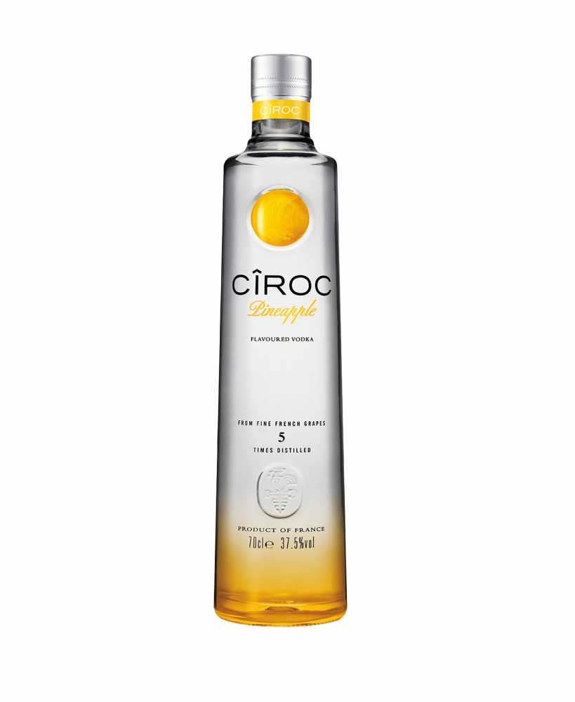 Ciroc Pineapple en 70cl, la dernière nouvelle de la gamme Cîroc sortie en 2014 pour l’Amérique et très attendu en France, est enfin arrivé. Comme toutes les autres vodkas Ciroc, elle est distillée 5 fois et ensuite infusée à l’ananas naturel. L’ananas explose dans la bouche ainsi que des notes de fruits tropicaux avec une touche subtile de vanille et une finale soyeuse et lisse. A déguster pur, avec des glaçons ou alors en cocktail.