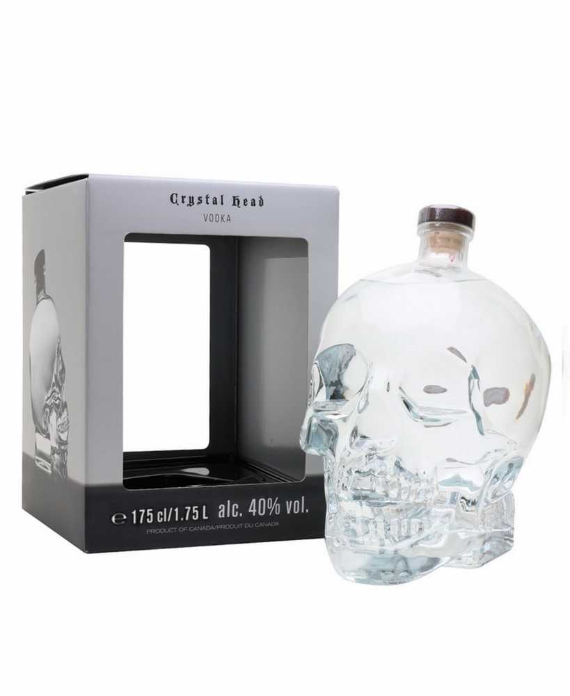 Crystal Head en grande version 175 cl. Une vodka, sans additif, réalisée à partir de céréales canadiennes et distillée 4 fois avec de l'eau cristalline pure des glaciers qui se trouve à Terre-Neuve au Canada. Le filtrage se fait 7 fois dont 3 fois à travers des diamants de Herkeimer (cristaux vieux de 500 millions d'années). La mise en bouteille se fait manuellement. La légende des 13 crânes de cristal Maya fut la source d'inspiration pour le design de ces bouteilles.