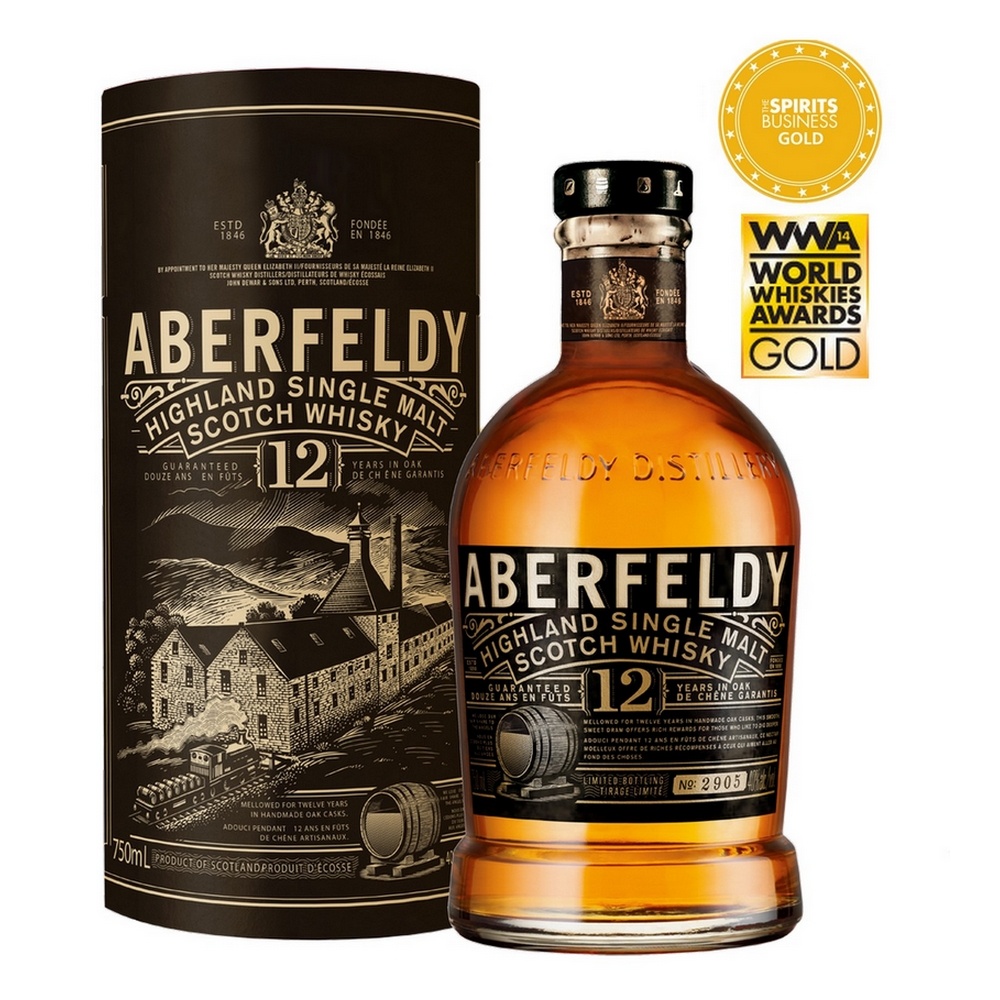 La distillery Aberfeldy, créée en 1898, est située sur la rivière Tay dans les hauts plateaux du centre des Highlands, en Ecosse, et à deux pas de la maison natale de leur fondateur et pionnier du "blending", John Dewar. Les notes de miel caractérisent ce whisky, qui a été obtenu par la fermentation réalisée dans des "washbacks" traditionnels et un vieillissement en fût de chêne durant 12 ans. Ce single malt a obtenu plusieurs médailles d'or et en 2014, aux World Whiskies Awards, il a été élu "Meilleur Single Malt des Highlands".
